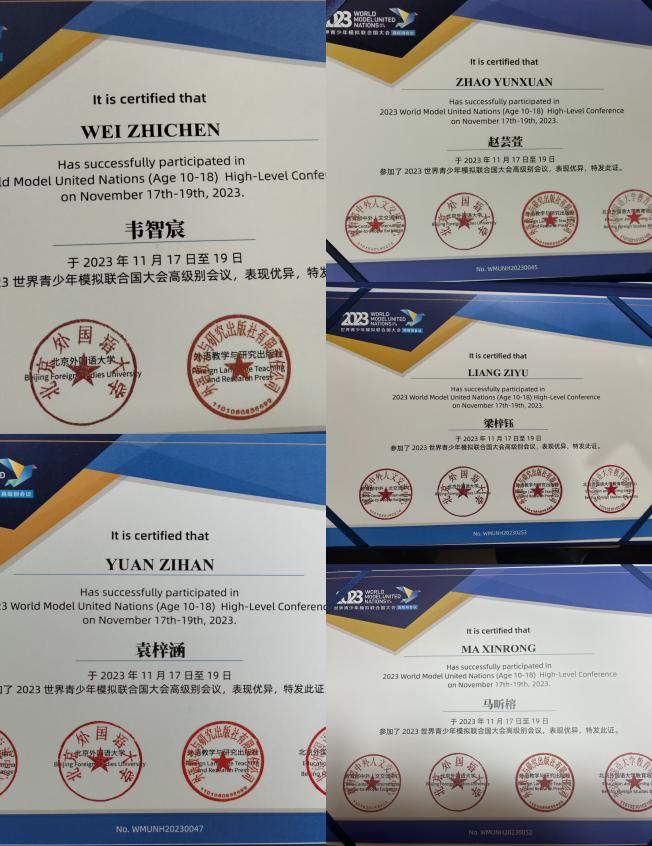 11月17日至19日,在学校的大力支持下,我校吴昌龙老师带领由8月世界模联广西赛区选拔出来代表广西参赛的5位同学参加了在北京外国语大学举办的世界青少年模拟联合国大会高级会议。大会由教育部中外人文交流中心和北京外国语大学联合主办,是面向基础教育阶段师生开展的具有示范性的模拟联合国实践和高层次模拟交流平台。本次正式会议议程为期两天,我校学子参加了初中英文会场以及初中中文会场。这是我校首次参加世界模联高级会议活动。