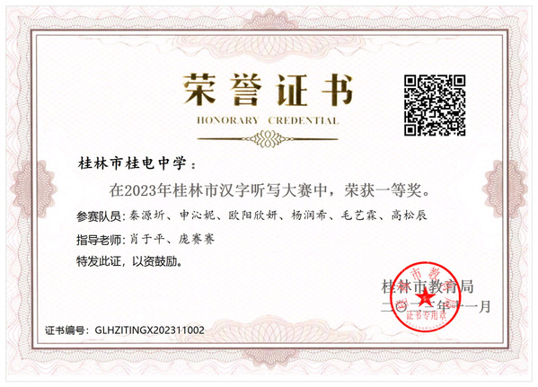 汉听大赛传捷报 桂电中学获佳绩——热烈祝贺桂电中学荣获2023年桂林市汉字听写大赛一等奖时间:[2023-12-16] 来源:桂电中学 点击数:64