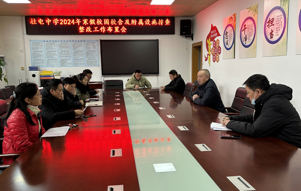 首先,检查组在行政楼会议室召开了期末校园安全工作布置会。会上,文向东传达了桂林市教育局《关于进一步加强 2024 年寒假期间校园校舍及附属设施排查整改工作的通知》,并对期末校园安全工作进行了布置。