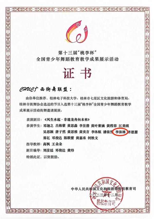 热烈祝贺我校高44班李沫林同学参加的舞蹈《风生水起.非遗龙舟向未来》入选第十三届“桃李杯”全国青少年舞蹈教育教学成果展示活动街舞邀请展演。 近日,由中华人民共和国文化和旅游部主办的第十三届“桃李杯”全国青少年舞蹈教育教学成果展示活动在北京舞蹈学院落下帷幕,由桂林电子科技大学、桂林市七星区文化旅游和体育局、桂林市街舞协会选送的原创街舞作品《风生水起·非遗龙舟向未来》从全国60余所院校及50余个社会单位选送的近150个作品中脱颖而出,成功入围20个优秀节目之一,并进入现场展演,是广西唯一入选的舞蹈作品,我校高44班李沫林同学参与演出。