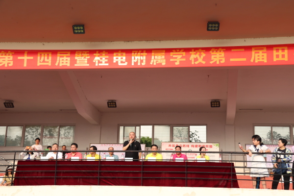 (图:运动员代表、裁判员代表宣誓) 校长彭剑波宣布桂林市桂电中学第十四届暨桂电附属学校第二届田径运动会开幕!