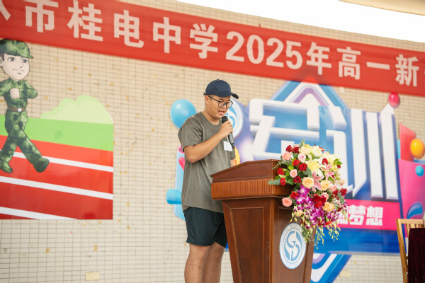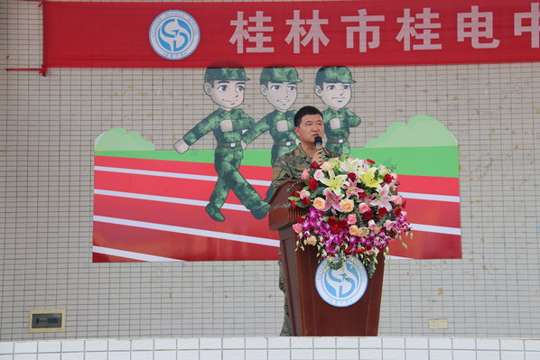 桂电中学校长彭剑波作军训动员讲话,他首先向全体新生表示热烈欢迎,并向承训教官致以崇高敬意和衷心感谢。他指出,军训是高中生活的第一课,是增强国防观念、锤炼意志品质、培养集体精神的重要途径。他从思想认识、遵守纪律、学以致用等方面对同学们提出要求,希望同学们以军人的标准严格要求自己,服从命令、听从指挥,刻苦训练、迎难而上,圆满完成军训任务。