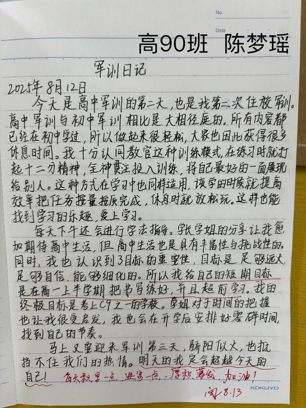 优秀军训日记展示(一) 每一天,汗水交织梦想! 每一天,都是成长的印记! 一起来看看同学们的军训感悟吧!