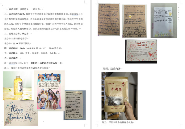 9月10日,各班学生通过制作卡片、绘制黑板报、诗歌朗诵、表演等用自己独特的方式,向辛勤耕耘的老师们表达深深的敬意和感恩之情。“老师,您辛苦了!”“祝老师节日快乐!”一句句真挚的问候在校园里回荡。学生们精心准备的手写信件,用真诚的文字,述说着对老师的感激之情,字里行间,都是平日里难以说出口的心里话。有些班级为老师准备了简单却温馨的庆祝活动:一首合唱、一段朗诵、一个小品表演......虽然形式简单,但每份心意都让老师们感动不已。