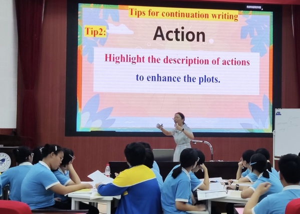 (赵雪卿老师上课) 龚晓梅老师与高二89班学生则围绕“Hot Hot Hot”一文开展读后续写教学。龚老师从气候变化这一全球议题切入,聚焦学生熟悉的夏日高温体验,创设真实而贴近生活的情境。她引导学生从空间线索、行为线索、情感变化、修辞手法和结构首尾呼应等五个维度深入解析文本,不仅帮助学生把握文章内容与结构,更在欣赏语言之美(如排比、明喻、隐喻和夸张等)的过程中提升文学审美能力。课堂最后以高考真题范文为例,实战操练读后续写的思维方法与写作技巧,学生高度投入、反应积极,展现了良好的文本解读与语言应用能力。
