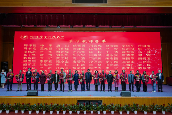 校党委书记唐平秋代表学校党委、行政,向70余位近两年光荣退休的教职工,向全体离退休老同志表示衷心的感谢和崇高的敬意。他指出,荣休教职工把美好年华献给了桂电,见证了学校的改革、建设、发展,是学校的宝贵财富,是年轻教师奋发向上的精神动力,是青年学生成长进步的励志榜样。学校的每一点变化、每一步发展、每一项成就,都蕴含着他们的心血和智慧,凝结着他们的辛勤和汗水。他希望荣休教职工退休不退志、离岗不离心,一如既往地关心、支持学校事业的发展,积极帮助青年教师成长,争做爱党爱国的坚定者、桂电精神的传承者、青年师生的引路者。学校将以“思想上关心、生活上照顾、精神上关怀”为宗旨,用心用情、尽心尽力做好离退休工作,为离退休教职工提供周到细致的服务,定期向大家报告学校工作情况,及时分享事业发展的喜悦。希望广大教职工尤其是青年教师,要汲取老同志身上的宝贵经验、优良作风、光荣传统,学习老同志的忠诚品格、育人信仰、公仆情怀,牢记为党育人、为国育才的初心使命。广大青年学生要爱校荣校、勤奋苦学、全面发展,以实际行动回报老师们的谆谆教诲。