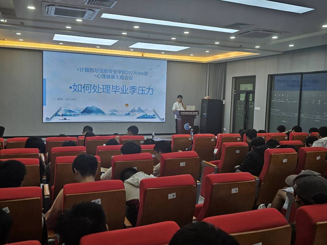 为深入贯彻落实教育部等十七部门《全面加强和改进新时代学生心理健康工作专项行动计划(2023—2025年)》文件精神,进一步提升研究生心理素质,营造健康向上的科研学习氛围,2025年5月22日,计算机与信息安全学院以“培育阳光心态,护航科研人生”为主题,开展毕业班系列心理主题班会,为研究生毕业生健康成长保驾护航。学院针对研究生毕业生群体常见的学业压力、科研焦虑、就业困惑等问题,通过班级班会心理教育、导师访谈、心理委员反馈等形式,精准摸排学生心理状态,并以‘主动预防、精准干预、全员参与’为原则,构建‘学校-学院-导师-班级’四级联动机制,为研究生毕业生提供全方位心理支持。
