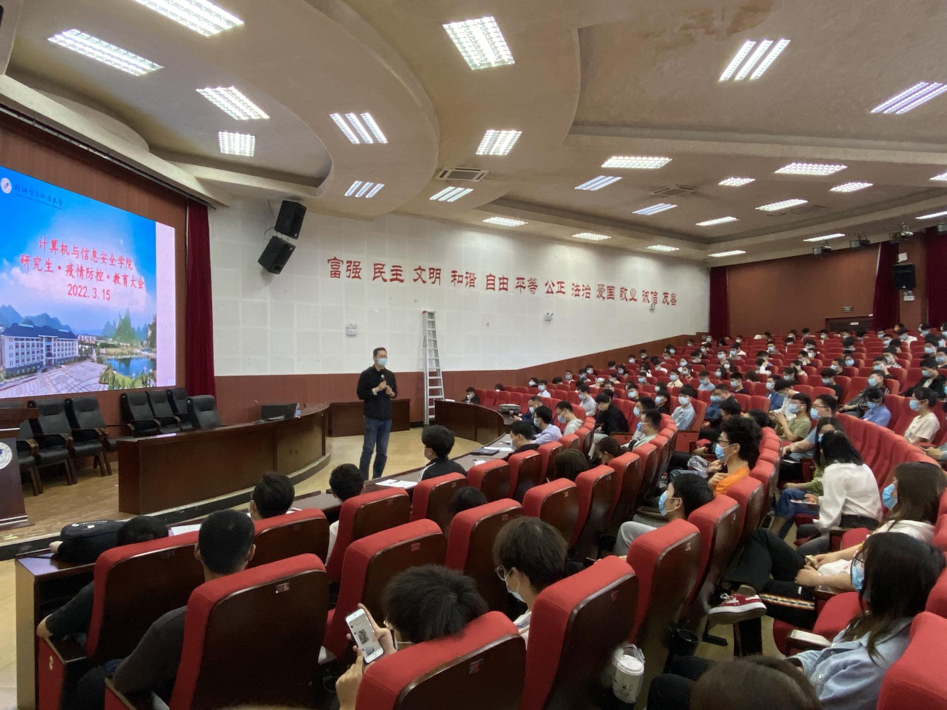 3月15日,计算机与信息安全学院疫情防控·安全返校教育大会在金鸡岭校区三教一楼报告厅召开,全体研究生参加。