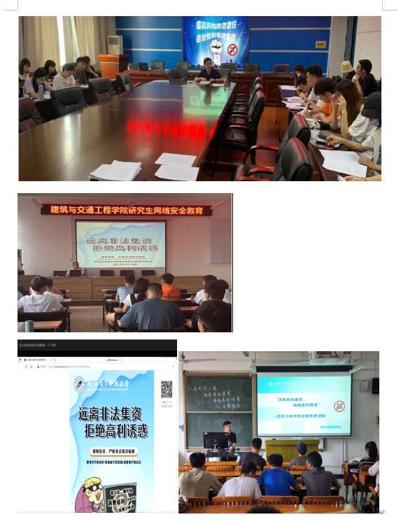 近日,为维护校园安全环境、提高学生增强防范意识,各学院通过线上或者线下的班会形式开展了研究生“远离非法集资、拒绝高利诱惑”主题教育会议。在互联网环境下,诈骗手段和形式呈现多样化趋势,诈骗事件屡屡发生。本次主题教育向学生们普及了非法集资的相关知识,介绍了非法集资、高利贷的严重危害与求助方法,提高了学生的反诈警惕性。