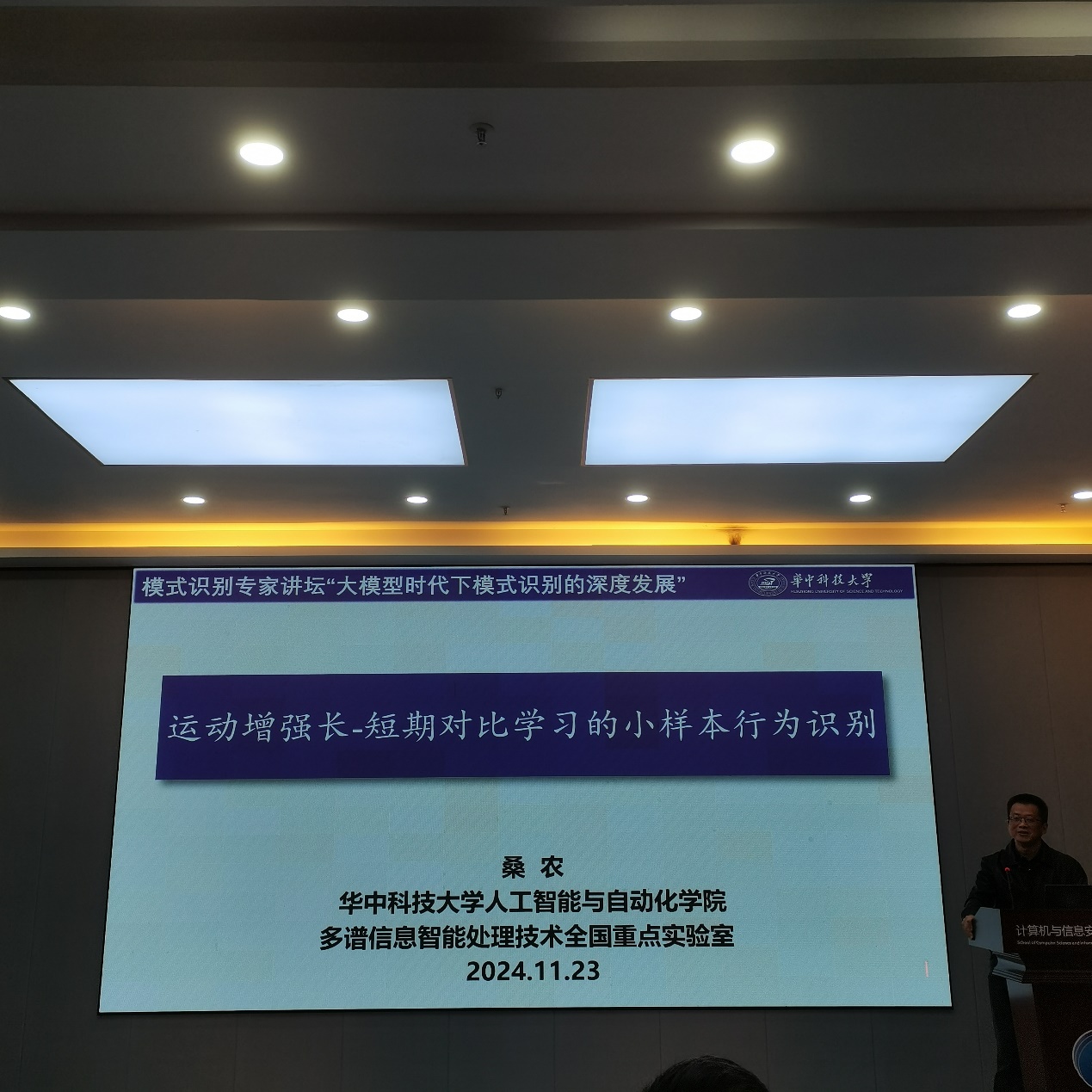 接下来,来自华中科技大学桑农教授为本次讲坛带来了题为“运动增强长-短期对比学习的小样本行为识别”的报告。报告首先提出对于某些特定应用往往难以获得足够的样本用于行为分析模型的训练,需要引入小样本学习技术,需要研究小样本条件下的行为识别问题。报告全面介绍了他们提出的运动增强长-短期对比学习小样本行为识别网络。提出的识别网络通过提取具有全局信息感知能力的帧级特征,以及具有运动信息感知能力的帧差特征,有效提升了小样本条件下的行为识别性能。