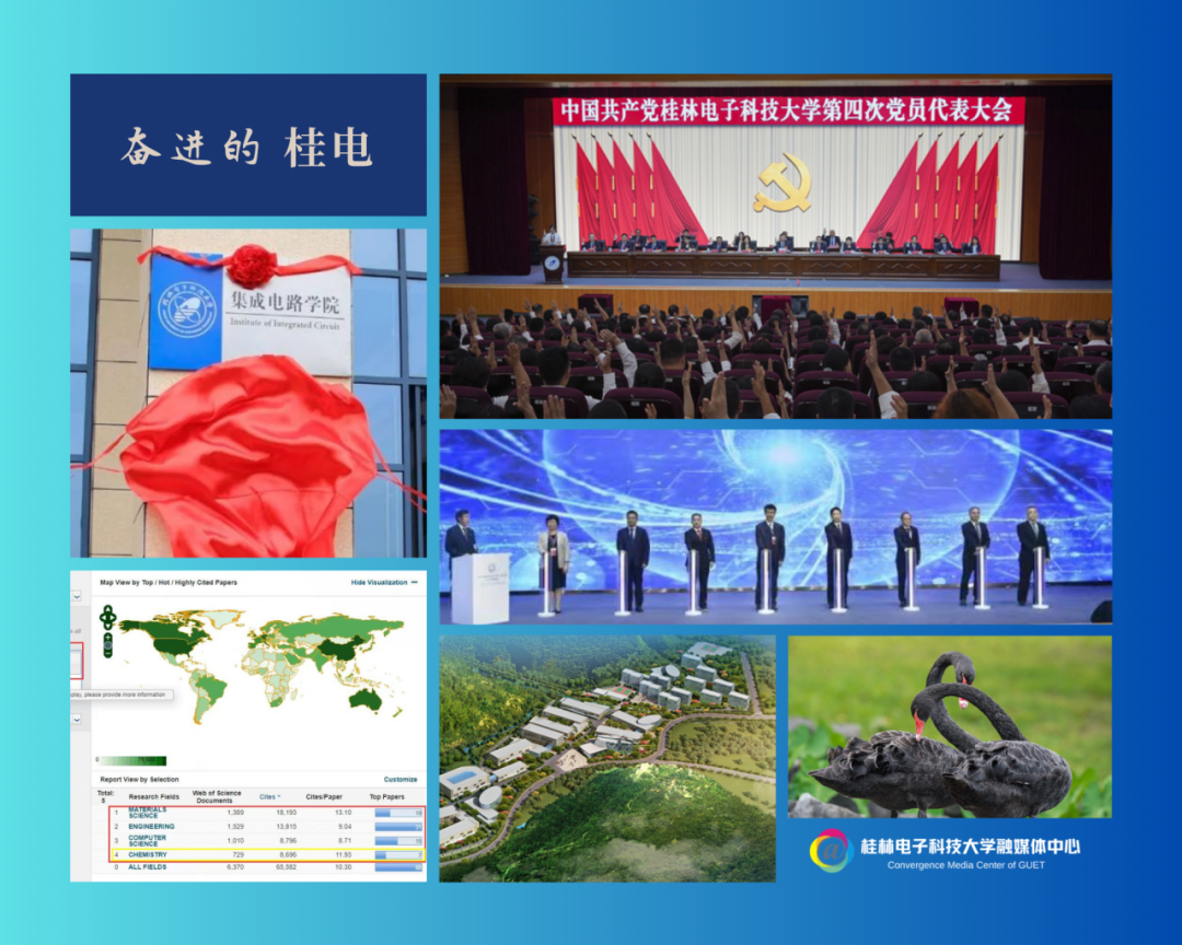 何其欣慰,我们看到了奋进的桂电。翻开桂电办学发展的历史,每一页都记载着奋进的故事、昭示着奋进的力量、承载着奋进的辉煌。你们在桂电求学的这几年,更是学校快速发展的几年。办学定位更加清晰,学校第四次党代会擘画了建设电子信息特色鲜明的高水平大学的宏伟蓝图。办学实力更加彰显,成立了集成电路学院、卓越工程师学院、中国—东盟电子信息技术创新学院等一批特色学院,4个学科入选ESI全球排名前1%,通过工程教育认证的本科专业数名列全国第16位,科技成果转化合同金额位居全国第87位。办学影响更加深远,学校与桂林市共建“花江智慧谷”、与南宁市合作推进南宁研究院“113工程”开创了产教融合的桂电样板。办学条件更加优越,建成了科技楼、四创中心、智慧教室等一大批教学科研用房,连我们美丽校园的“校宠”天鹅来了都不想走。