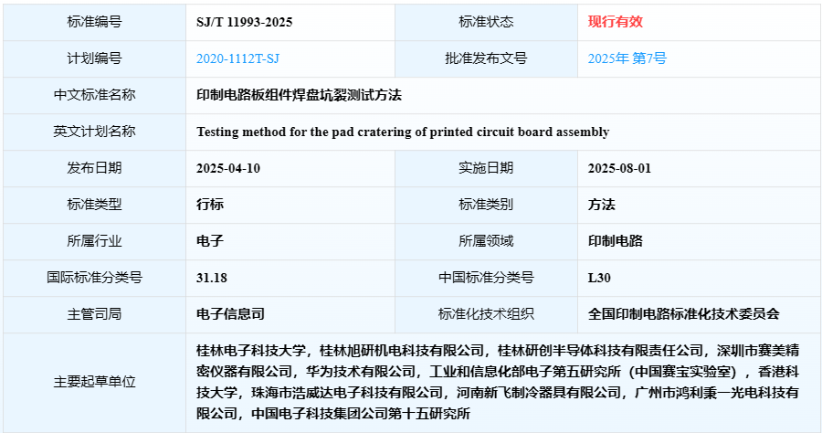 近日,广西高校微电子封装与组装技术重点实验室蔡苗教授主持编制的国家工业与信息化部电子行业标准《印制电路板组件焊盘坑裂测试方法》(标准号:SJ/T 11993-2025)正式发布,将于2025年8月1日实施应用。在机电工程学院先进电子封装团队蔡苗教授和杨道国教授的共同带领下,团队历经多年深入研究与实践探索,经数据收集、实验验证与技术优化后编制完成。标准工作获桂林旭研机电科技有限公司、桂林研创半导体科技有限责任公司、深圳市赛美精密仪器有限公司、华为技术有限公司、中国赛宝实验室等参编单位,以及我校各级部门的大力支持,参编单位协同攻关确保标准科学先进实用。本行业标准规定了印制电路板组件焊盘坑裂测试方法、测试步骤、测试报告等方面的要求,特别适用于自动化、数智化检测应用场景,解决了印制电路板制造和使用过程中焊盘坑裂问题无统一规范可依、测试手段复杂低效、难以适应现代电子制造高精度与自动化需求、测试成本较高等痛点问题。