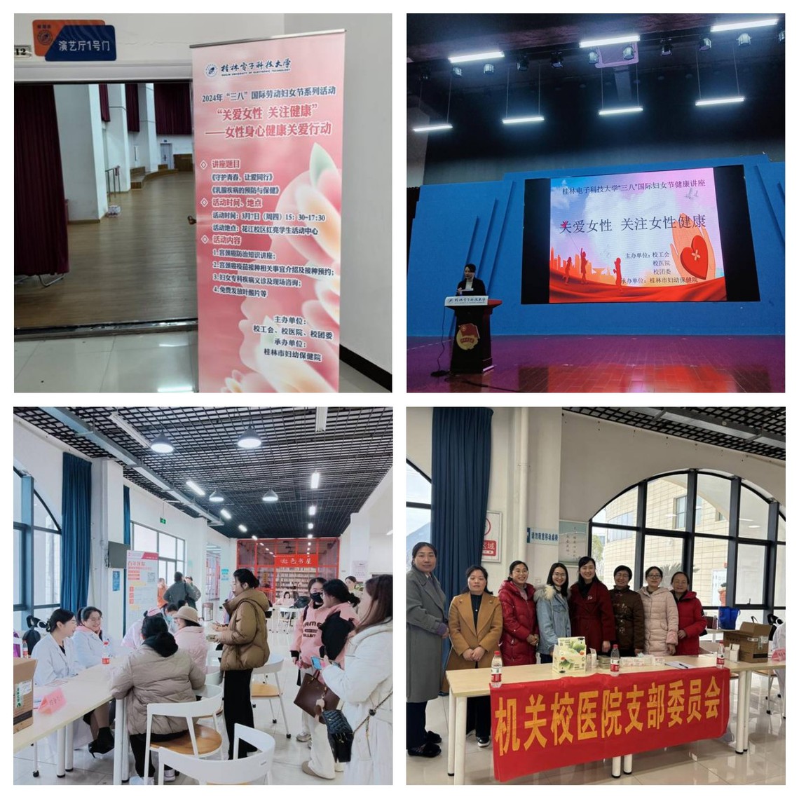 在“三八”国际劳动妇女节来临之际,为切实关爱我校广大女性师生身体健康,进一步增强妇女自我保健意识,2024年3月7日,由校医院、校工会以及校团委联合举办的女性身心健康关爱行动在花江校区举行,来自桂林市妇女儿童医院的医务人员热情地为我校女性师生开展健康讲座及义诊活动。