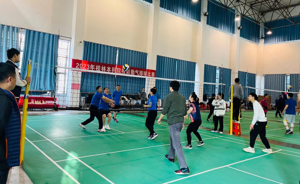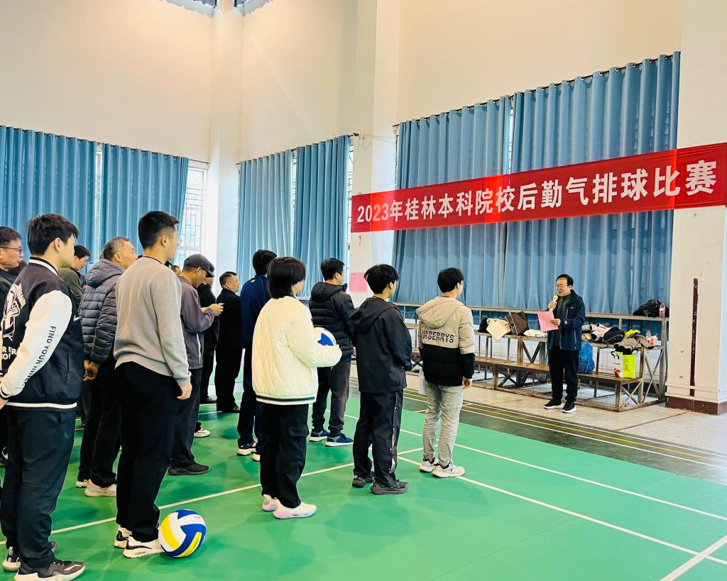 为了进一步促进桂林本科院校后勤部门深入交流,增强高校后勤凝聚力,同时贯彻落实全民健身战略,2023年3月4日上午,2023年桂林本科院校后勤气排球比赛在我校金鸡岭校区体育馆举行。本次气排球比赛由我处承办,处长黎昕主持开幕式。我校党委常委、总会计师曹辉景出席比赛开幕式并致辞,广西师范大学、桂林理工大学、桂林电子科技大学、桂林医学院、桂林航天工业学院、桂林旅游学院等6所桂林高校后勤部门的领导和参赛队员共计60余人参加了此次比赛。