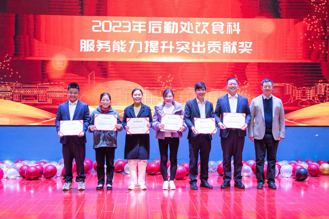 在年终总结大会上,黎昕对2023年餐饮工作给予了充分肯定,希望饮食科要以不断满足师生对校园餐饮的美好向往为目标,笃行创新,奋勇争先,在新的一年争创更大成绩。随后,黎昕为2023年饮食科服务能力提升突出贡献奖获奖职工进行了颁奖。
