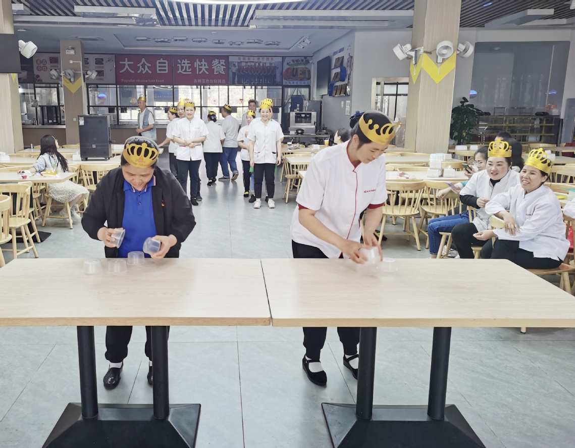 仲园第一餐厅员工代表谭建进行了发言,他对后勤处大家庭给予的关爱表示感谢;徐波对员工的辛勤工作给予了肯定,并为员工送上生日祝福。今年集体生日会增设了“叠杯子”等趣味游戏,员工分四组进行了比拼,均获得了雨伞、纸巾等礼品。