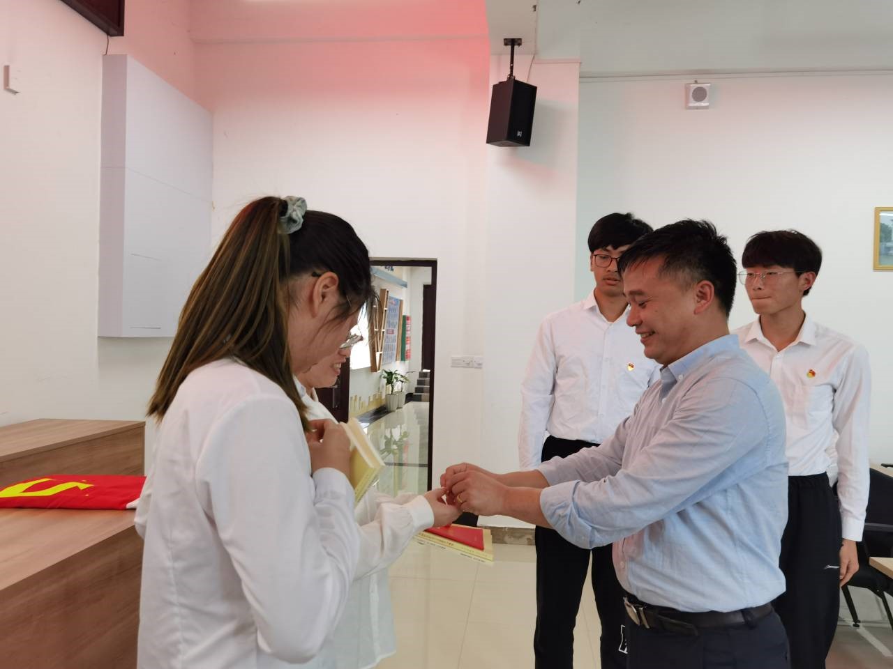 入党宣誓仪式结束后,龙腾飞为新发展党员佩戴党徽,并赠送《中国共产党章程》《中国共产党简史》和《习近平新时代中国特色社会主义思想学习纲要》等书籍。