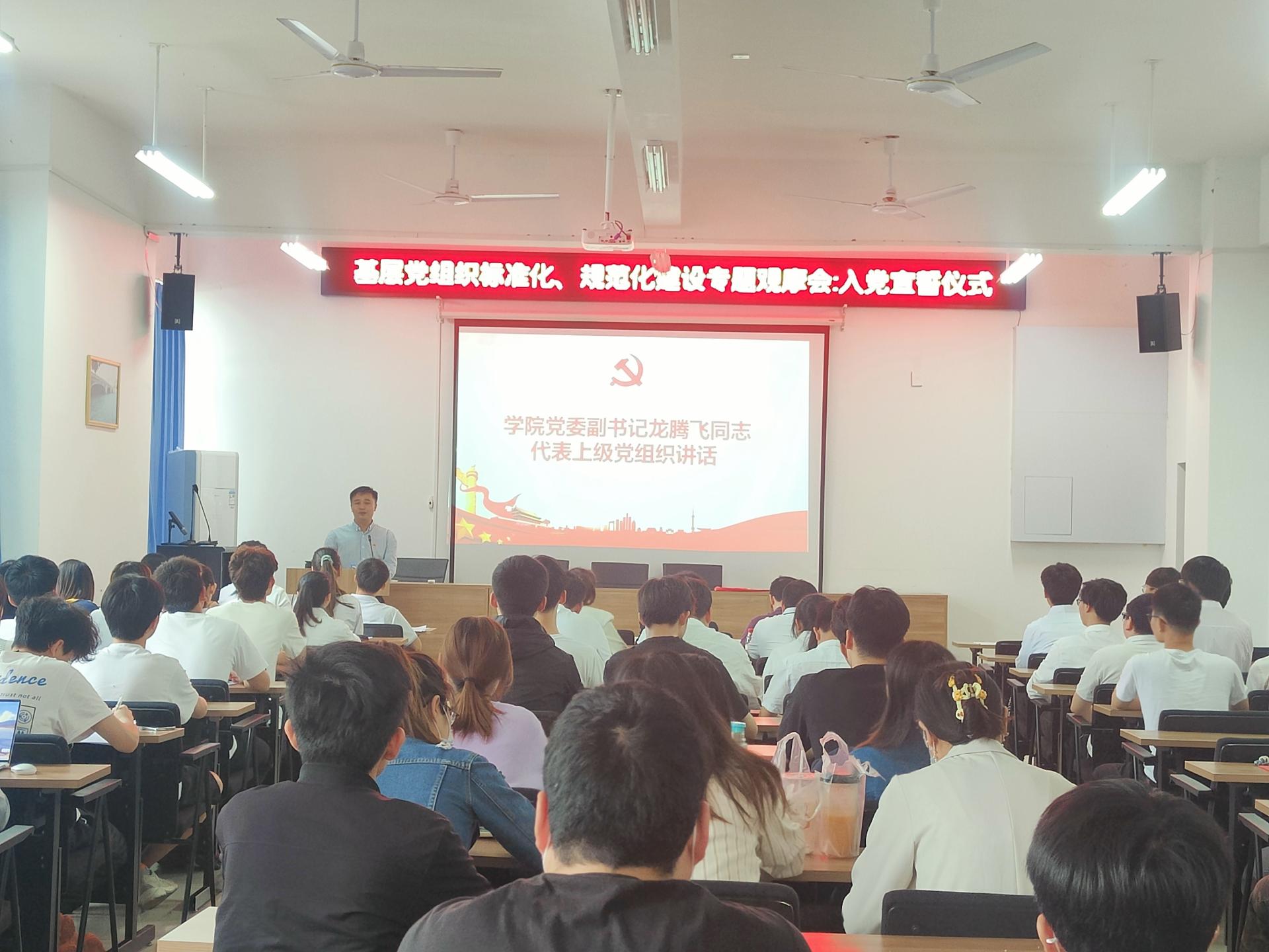 5月19日下午,建筑与交通工程学院党委在花江校区建交大楼401会议室召开主题党日活动观摩会,为两位新发展党员举行入党宣誓仪式。学院党委副书记龙腾飞、各支部书记、专职组织员及师生党员代表70余人到会观摩交流。