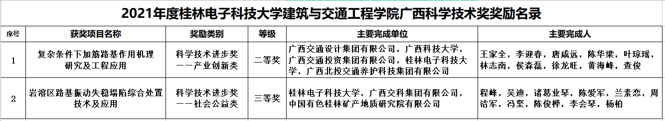 5月23日,2022年广西科学技术奖励大会在南宁主会场举行,桂林电子科技大学2021年度共有7项成果荣获广西科学技术奖,其中建筑与交通工程学院获得2项成果奖,分别是唐咸远老师(排名第三)课题组“复杂条件下加筋路基作用机理研究及工程应用”获得科技进步奖-产业创新类二等奖,程峰老师(排名第一)课题组“岩溶区路基震动失稳塌陷综合处置技术及应用”获得科技进步奖-社会公益类三等奖。