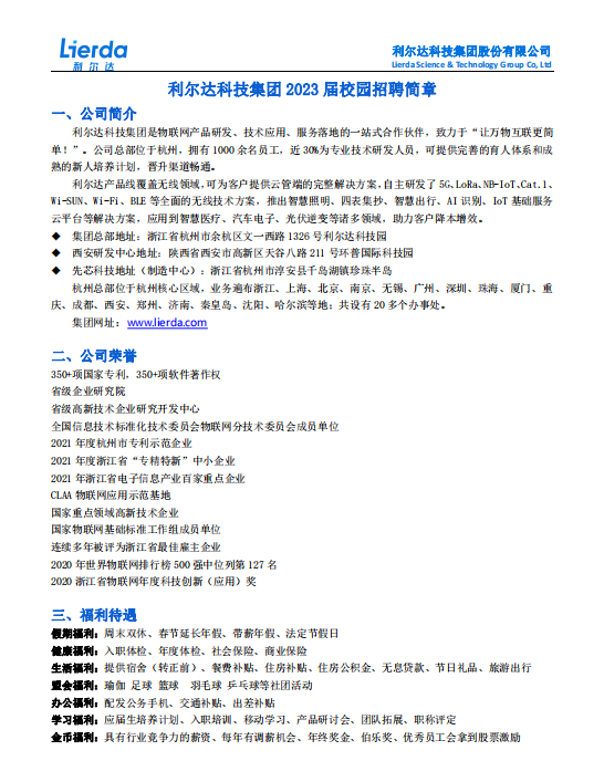 关于我们 利尔达科技集团股份有限公司,是一家提供物联网系统、智能产品解决方案的高科技企业。总部位于杭州,注册资金36049万元。2015年3月在新三板成功挂牌(证券代码:832149)。利尔达是国家重点领域高新技术企业,十余年来致力于物联网嵌入式行业的技术及市场推进,技术实力雄厚。公司员工30%以上为技术研发人员,拥有嵌入式微控制技术、射频硬件研发、通信、组网技术的深厚背景与丰富的实践经验。在物联网无线通讯领域,公司拥有NB-IoT、LoRa、Wi-Fi、BLE、ZigBee、RF等成熟通讯方案;其推出的节能照明、智能酒店、无线四表集抄、分室能耗监测分析、智慧冷链、智能电动车、智能零售终端、智能鞋等系统方案,被广泛应用,与阿里、IBM、腾讯、中兴、华为等众多龙头企业建立了合作关系。 随着利尔达品牌在物联网领域影响力的逐步提升,公司2018年度的品牌价值已飙升至84.52亿元。