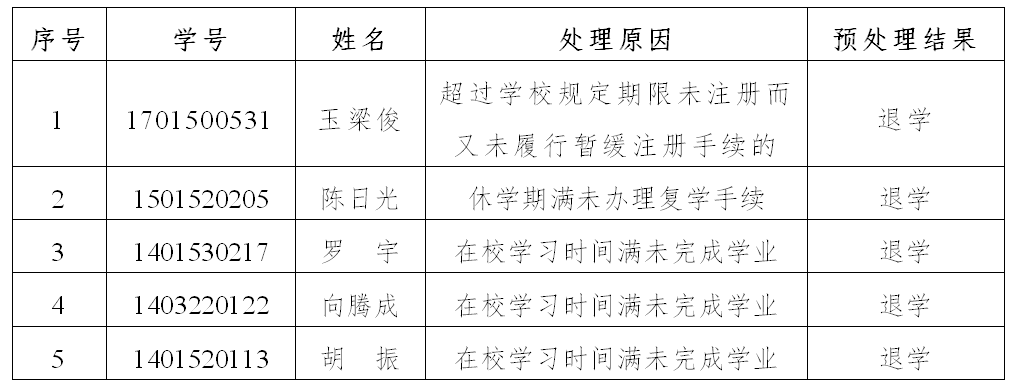 根据《桂林电子科技大学普通高等教育全日制本科学生学籍管理实施细则(修订)》(桂电教〔2019〕29号)相关条款,现对玉梁俊等5名同学学籍预处理公示如下: