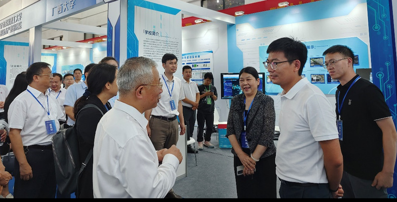 此次大会还组织了全区交通运输科技创新成果展,我院代表学校展示了近年来在“桥梁磁吸爬智能巡检机器人”、“桥梁巡检无人机”、“数字孪生路口”、“城市智慧停车平台”、“限定场景智能网联汽车”以及“远程驾驶与自动驾驶无缝切换平台”等交通领域产业化应用效果突显的10余项优秀技术成果。自治区交通运输厅党组书记、厅长刘可,自治区科技厅副厅长李克纯,自治区交通运输厅副厅长陆晓明、总工程师陈津维及相关单位领导参观了我校的展区,听取了我校先进交通运输科技成果服务地方的情况汇报。刘可等一行对我校科技成果转化应用成效予以充分肯定,并希望学校继续发挥智力和学科优势服务地方,助力广西西部陆海新通道建设。