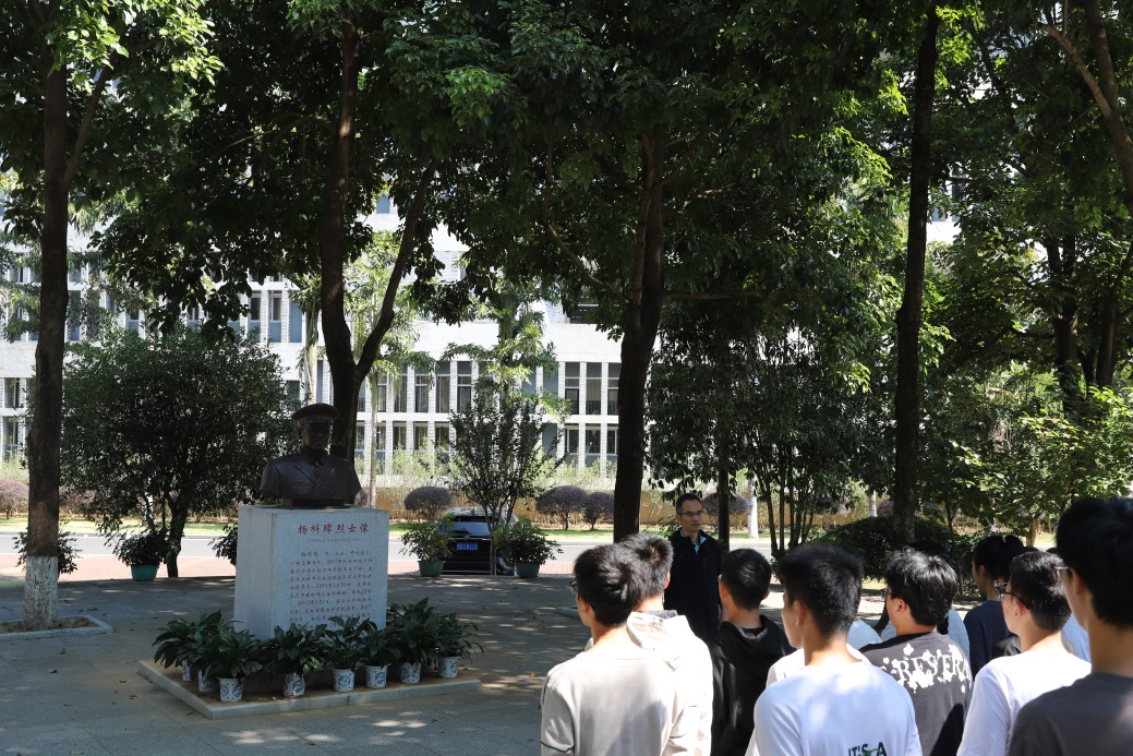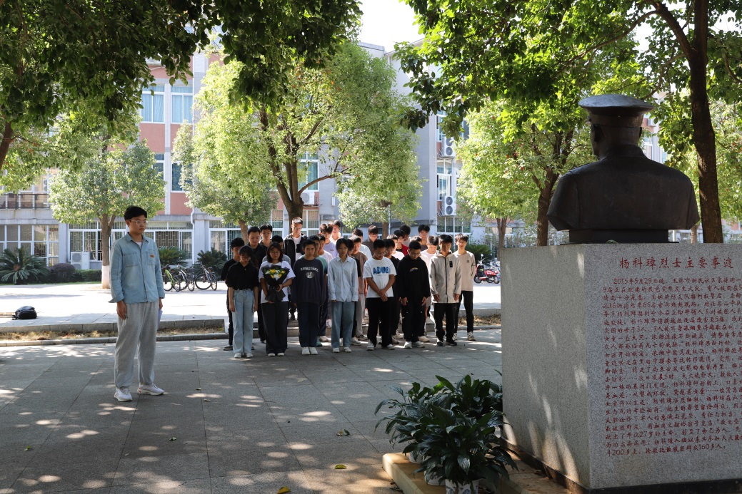 10月15日上午,2023级交通工程专业103班全体同学开展了缅怀优秀校友杨科璋烈士的主题团日活动,参加活动的还有班主任岑成贤老师和两位助班王子午、吴廷深同学,活动由班长朱建澎主持。活动中,班长朱建澎首先代表班级致词,然后全体师生向杨科璋烈士默哀三分钟,并向烈士铜像献花。最后,班主任岑成贤老师讲述了杨科璋烈士的英雄事迹,鼓励同学们向榜样学习,发愤图强,努力学习,成为一名合格的大学生。