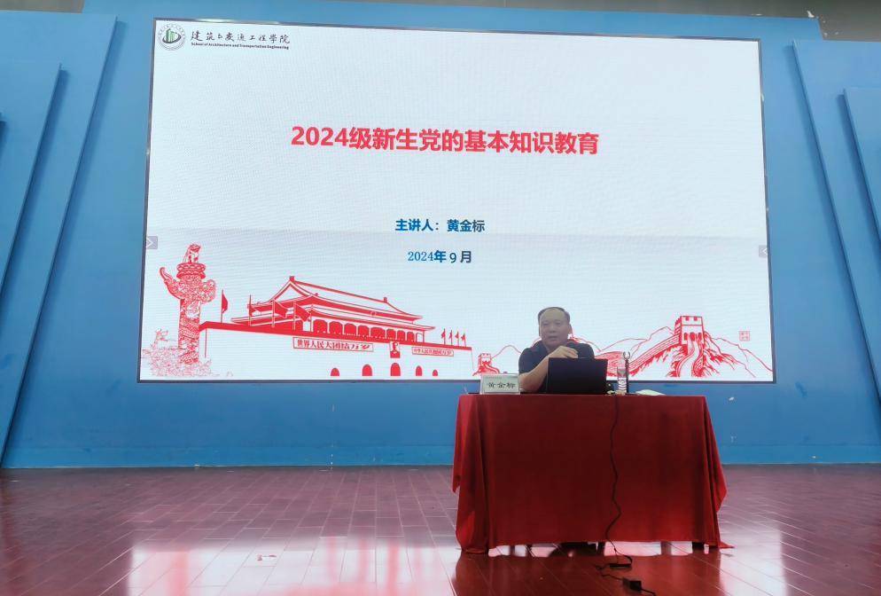 9月27日晚,建筑与交通工程学院党委书记黄金标在花江校区红亮学生活动中心,为2024级本科新生讲授“党的基本知识教育”专题课。学院党委副书记薛成斌、2024级辅导员及全体新生参加。