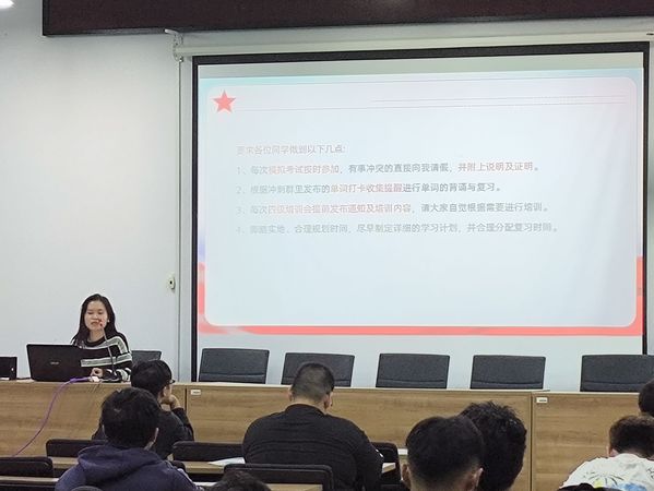 11月4日,我院2022级在建交大楼401召开四级备考布置会,2022级辅导员诸葛雪玉、相关年级委以及备考四级同学参加会议。会上,诸葛老师鼓励同学们重视听力阅读,实行分组学习,定期模拟测试,提倡每日单词打卡,增强词汇积累。通过本次活动,激发了学生的备考热情,为四级冲刺奠定了坚实基础。