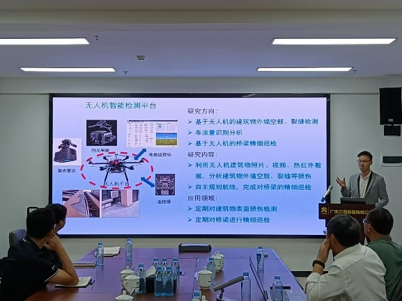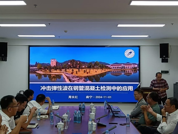 在交流会上,来自学院的多位教授进行了精彩的学术报告,分享了各自的研究成果和最新进展。唐咸远教授的报告题目为《早强型超高性能混凝土(UHPC)》,他详细介绍了UHPC的特性、应用场景及其在工程中的重要性。周长红教授以《冲击弹性波在钢管混凝土检测中的应用进展》为题,探讨了冲击弹性波技术在钢管混凝土检测中的创新应用,展示了该技术在提高检测效率和准确性方面的潜力。杨建波老师分享了《爬拱机器人研发实践》的报告,介绍了爬拱机器人目前的研发进展和未来应用前景。粟建波博士以《无人机智能检测平台建设》为题,阐述了无人机技术在工程检测领域的应用前景,强调了其在提升检测效率和安全性方面的优势。交流活动后,王涛院长表示,此次报告会不仅增进了学院与广西公路检测有限公司的合作关系,也为教师们提供了一个良好的学术交流平台,促进了学术思想的碰撞与融合。