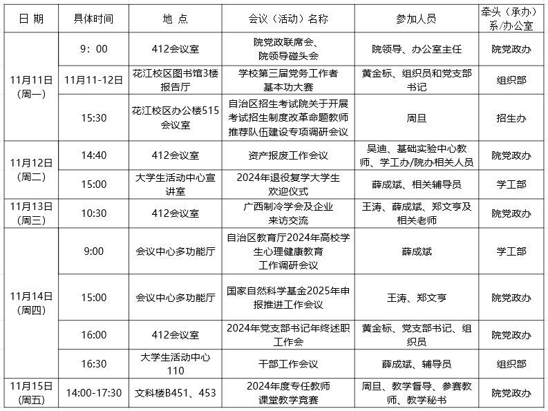 2024年秋季学期第10周建筑与交通工程学院重要会议(活动)安排