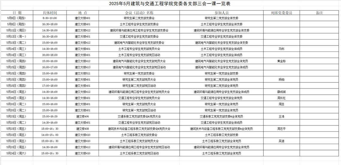 2025年5月建筑与交通工程学院党委各支部三会一课一览表