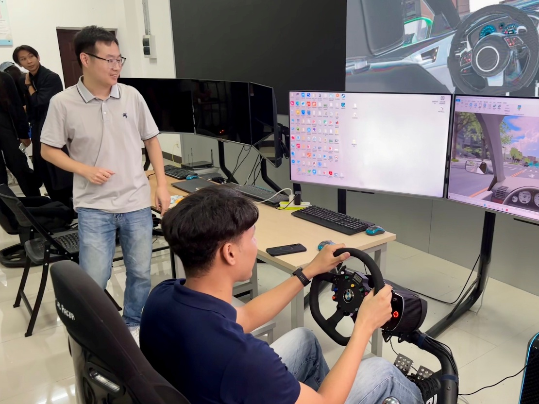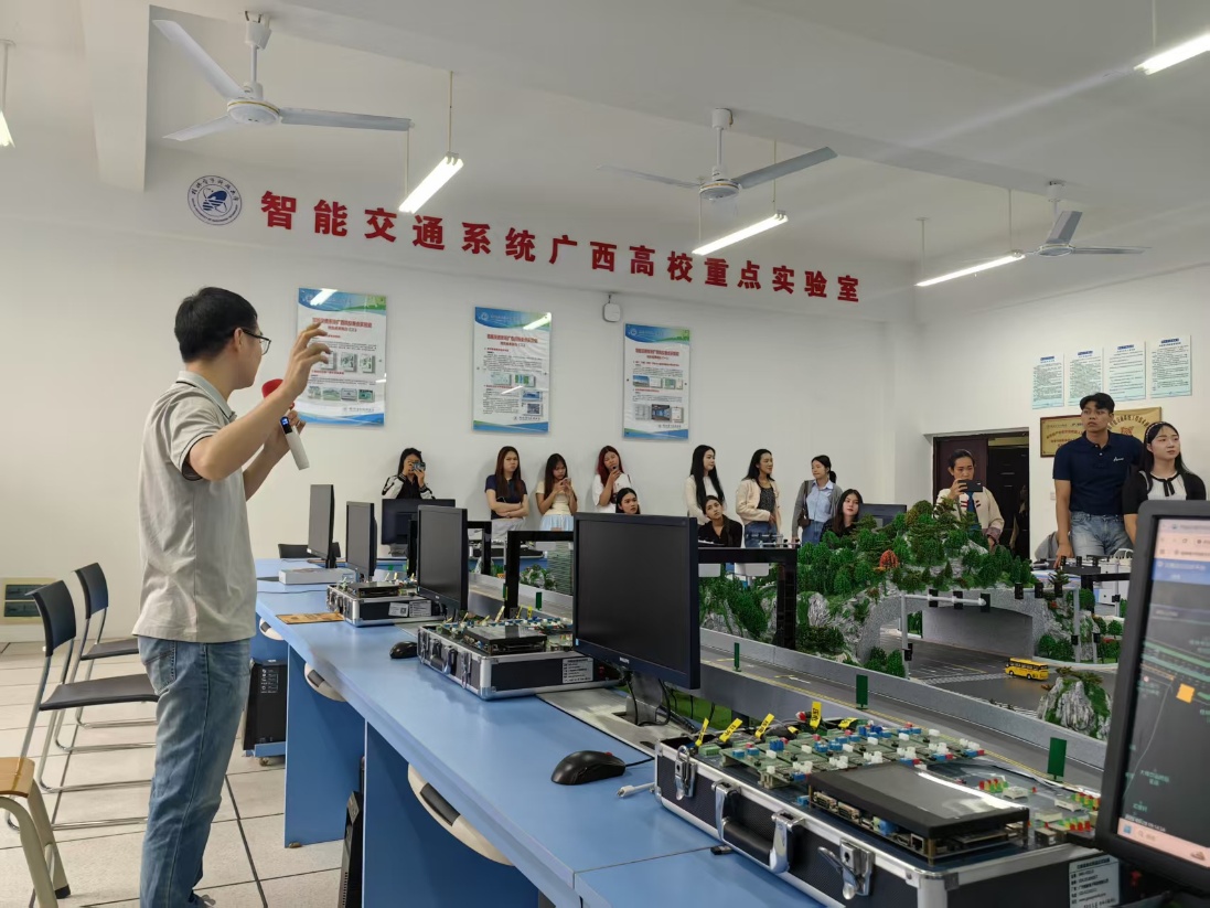 5月28日上午,来自泰国清迈皇家大学的25名师生参观广西智慧交通重点实验室。交通工程系主任廉冠副教授就实验室智慧管控平台、自动驾驶平台、智能网联汽车驾驶平台、结构大厅进行了教学讲解和演示,同学们热情高涨,亲自体验了各种驾驶模拟设备,并跟老师进行了深入交流。