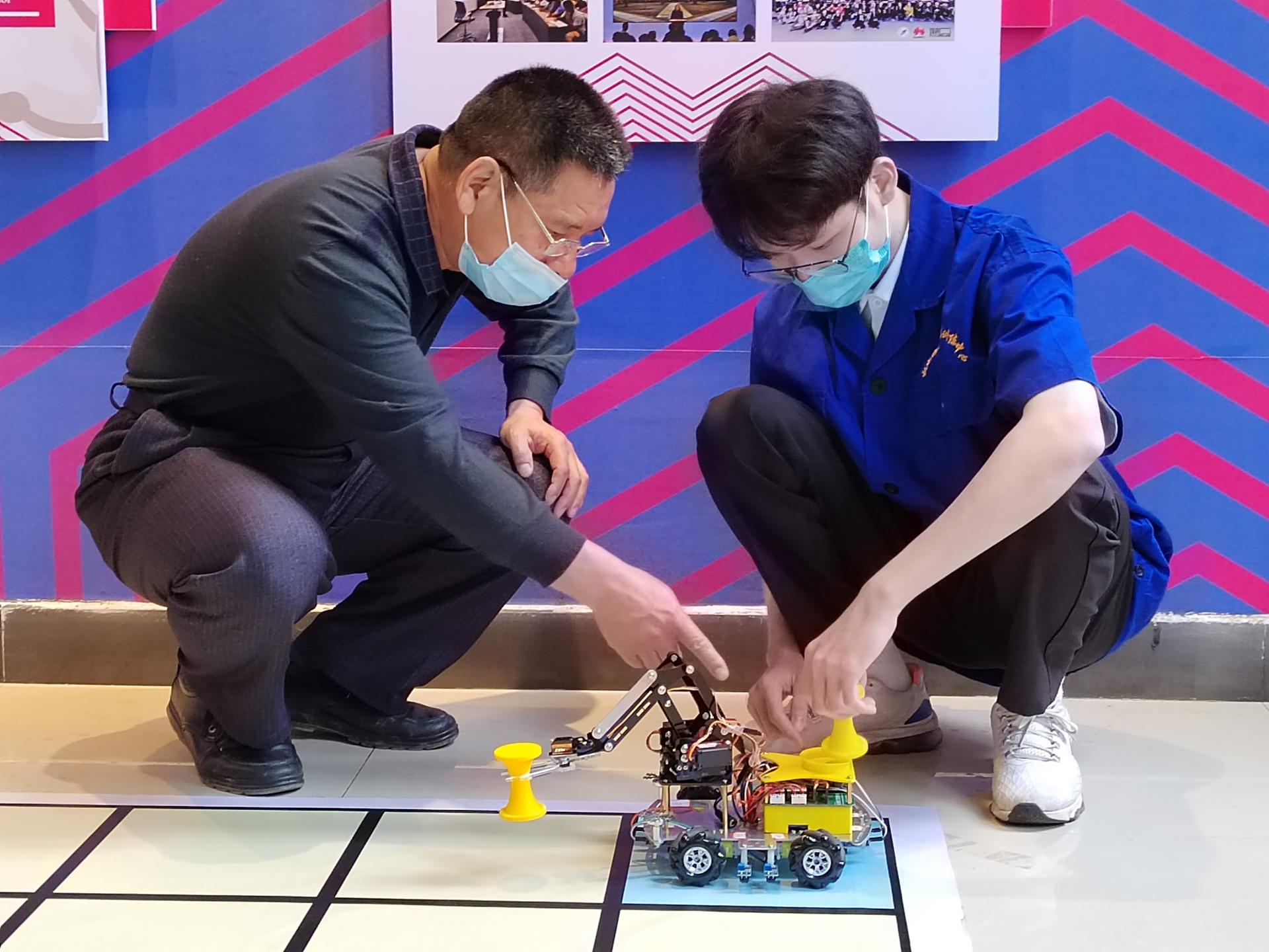 在验收现场,人工智能学院老师询问了学生们的训练情况和体验体会等;在交流研讨过程中,机械工程训练中心主任吕汝金老师介绍了课程定位、教学流程、训练内容、培养目标与实施意义等,人工智能学院一行老师对课程建设表示赞同,并对学生作品的现场表现给与了充分肯定和赞扬,双方老师还在理论与实践互为裨益方面深入交换了意见和观点;教学实践部领导一行对学生作品的现场表现给予充分认可和赞扬,同时对课程开展的内容、形式和训练效果给予了充分支持和肯定,并要求在此基础上继续完善新课程建设。