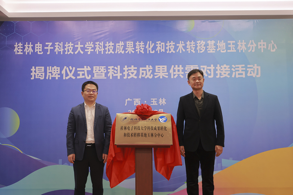 玉林市委常委、副市长张海鹏与我校副校长刘建明共同为桂林电子科技大学科技成果转化和技术转移基地玉林分中心揭牌