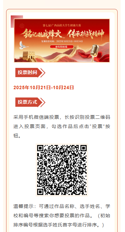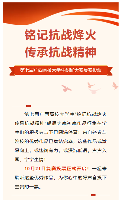 第七届广西高校大学生“铭记抗战烽火 传承抗战精神” 朗诵大赛复赛投票即将开始!