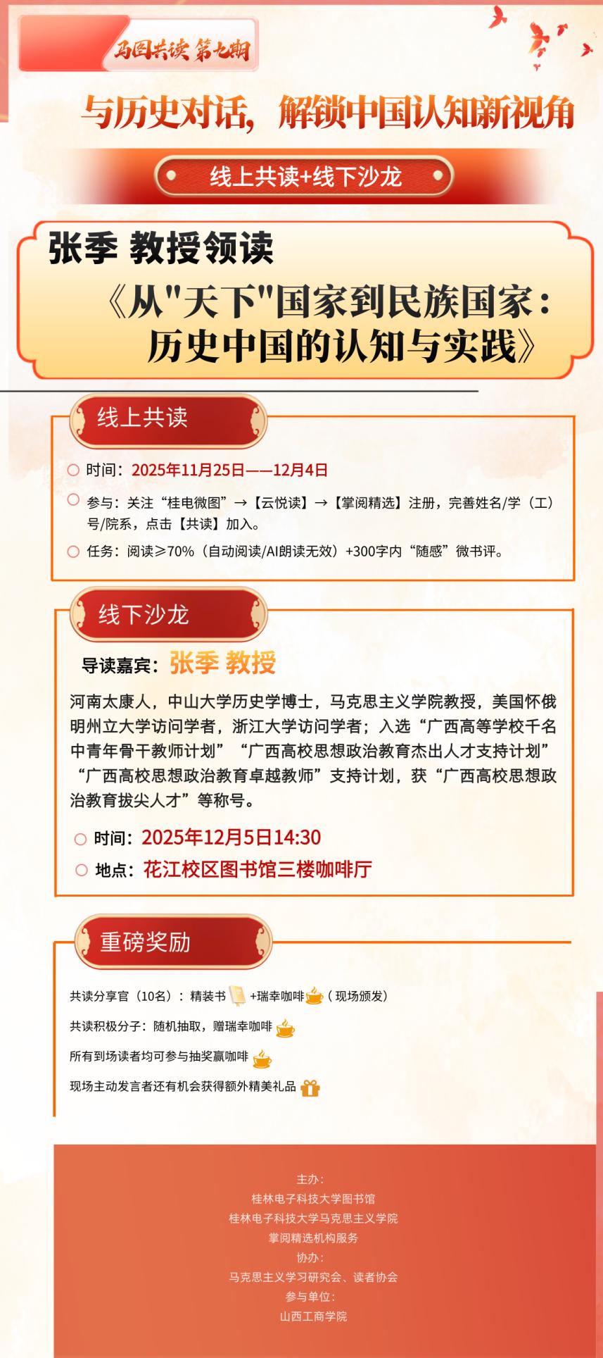 奖项:每人获《从“天下”国家到民族国家:历史中国的认知与实践》精装纸质书1本+瑞幸咖啡券1张,于读书分享会现场发放。