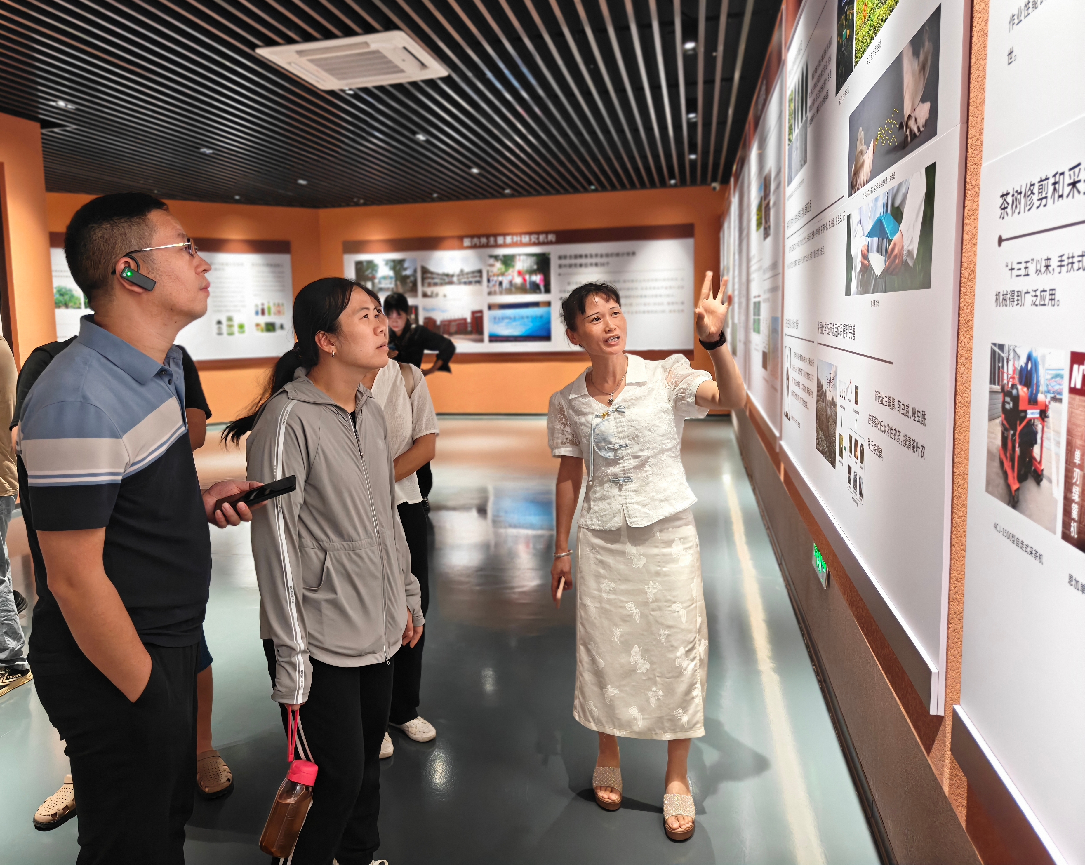 在茶科所工作人员的引导下,师生们参观了集科普教育、文化传承和科技展示于一体的综合展馆。展馆通过茶产业、茶文化、茶科技、茶科普以及研究所发展史五大板块,全景式展示了广西茶产业的发展与科技创新,让同学们直观感受到科技如何为这一古老产业注入新活力。