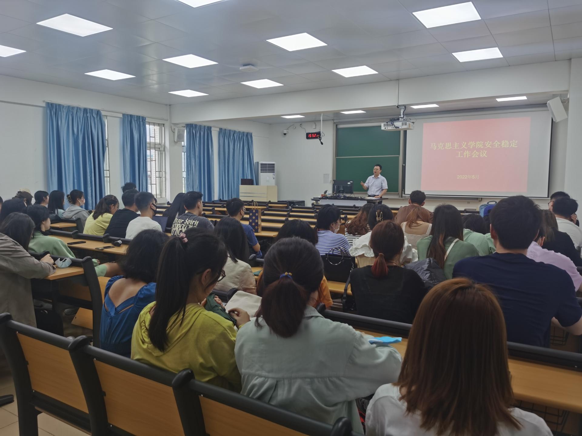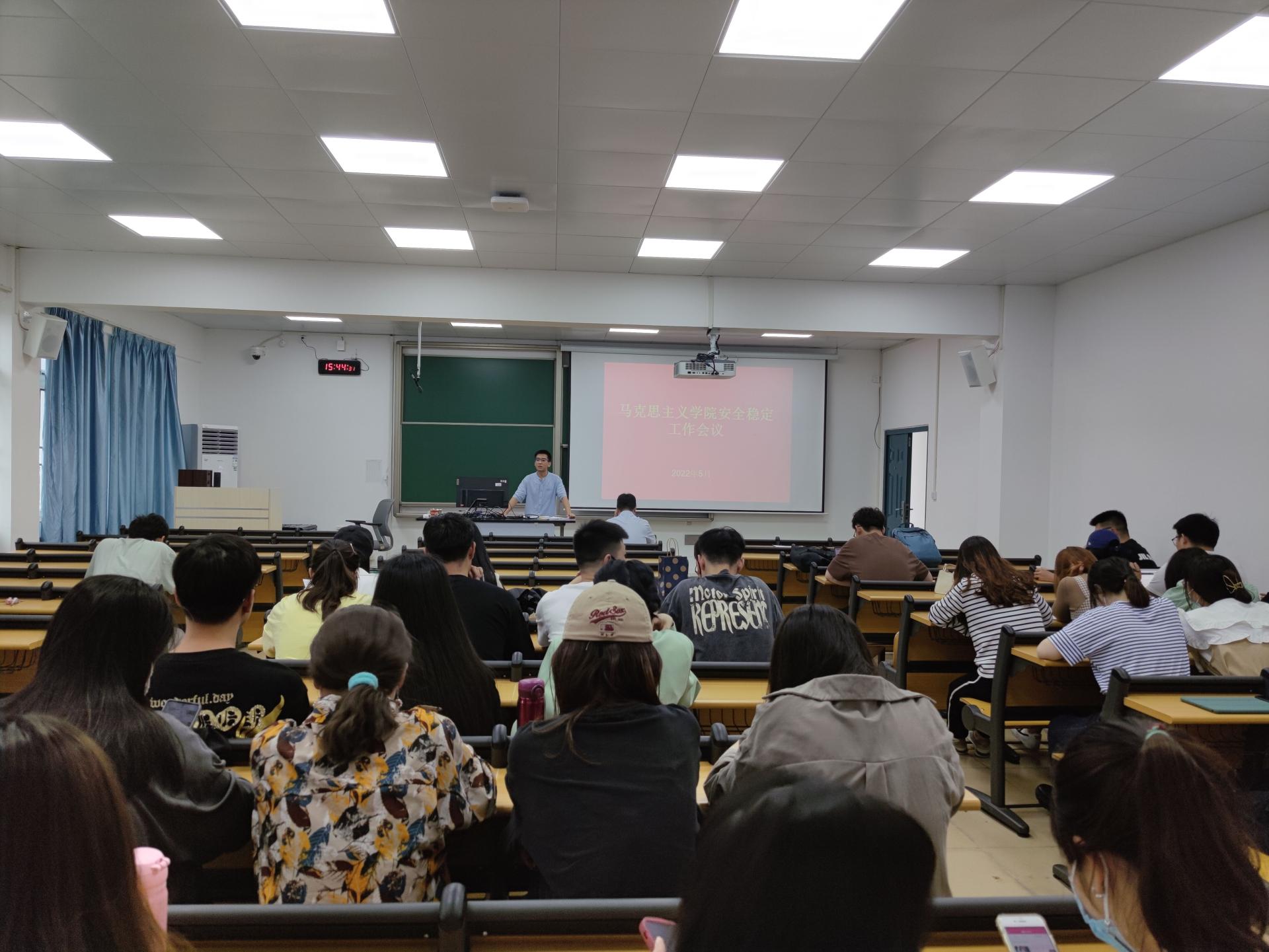 5月27日下午,我院在一教1504室召开全体研究生安全稳定教育会议,学院党委书记岳峰、研究生辅导员庞智和全体在读研究生参加会议,未返校研究生在线上参加会议。