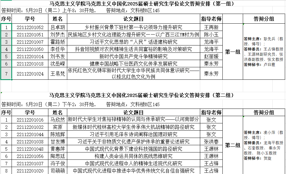 马克思主义学院马克思主义中国化研究方向2025届硕士研究生学位论文答辩安排