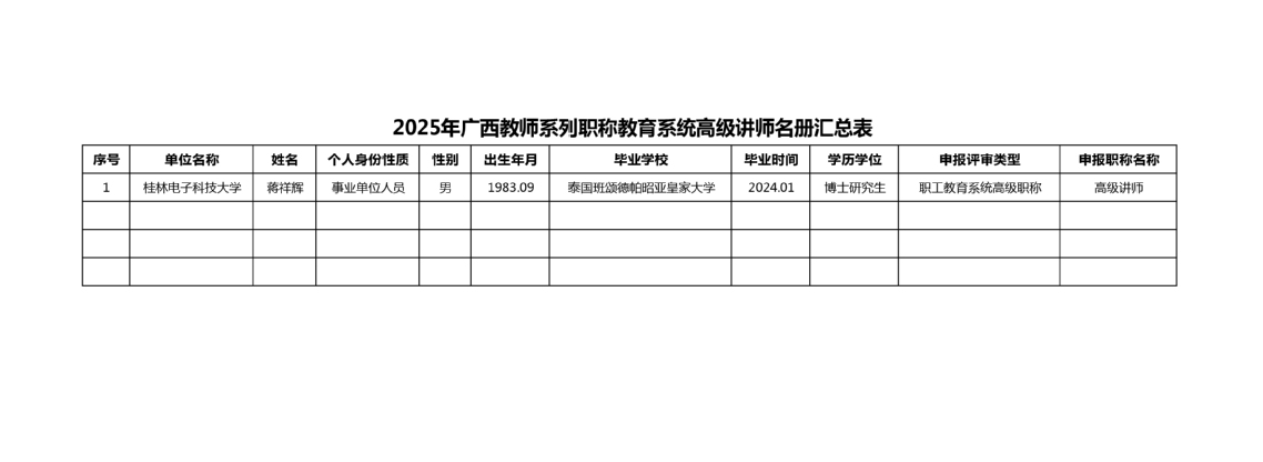 蒋祥辉同志申请评审2025年度广西教师系列职工教育系统高级讲师职称,现根据有关规定予以公示。公示时间从2025年8月29日至2025年9月4日。在公示期间,如对所公示的材料(公示材料请到文科楼201马院办公室查询)有异议,请用书面材料并署真实姓名、单位向单位职改办反映。单位(职改办)联系电话:13517839781
