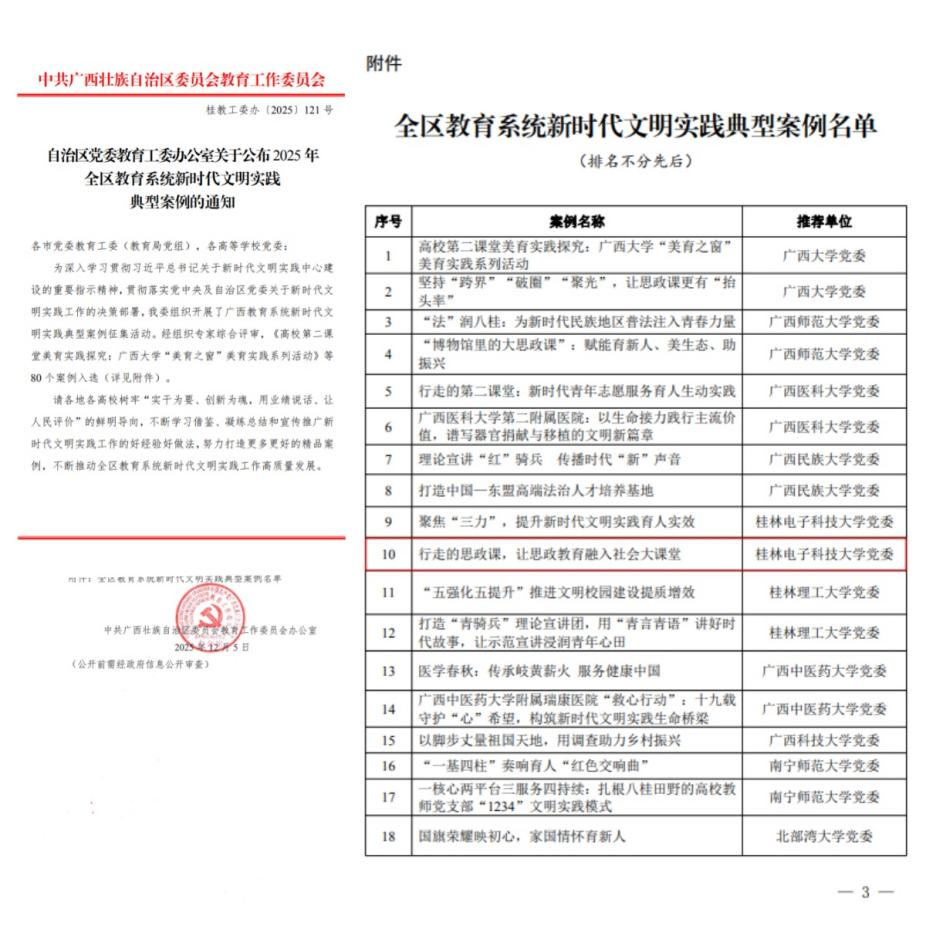 近日,自治区党委教育工委办公室下发《关于公布2025年全区教育系统新时代文明实践典型案例的通知》(桂教工委办〔2025〕121 号),由马克思主义学院岳峰、王万奇、柴靓撰写的《行走的思政课,让思政教育融入社会大课堂》入选2025年自治区教育系统新时代文明实践典型案例。