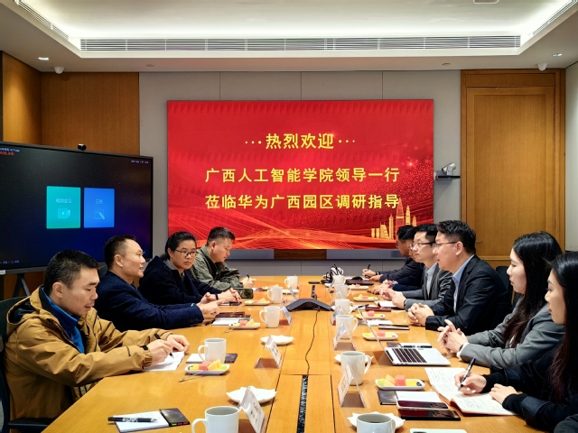 12月17日,桂电南宁研究院(广西人工智能学院)党委书记黄少波率队赴华为技术有限公司广西区域总部调研。双方就深化产教融合、协同育人进行了交流,华为广西政企业务副总经理翟晓奇等相关业务负责人参加。