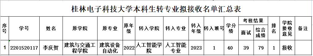 根据人工智能学院2023年本科生转专业工作实施方案,经学院专家组面试,综合学生学分绩、面试成绩,李庆贺同学符合2023人工智能学院转专业条件。现对2023年人工智能学院接收转专业学生结果予以公示。公示期为3个工作日。