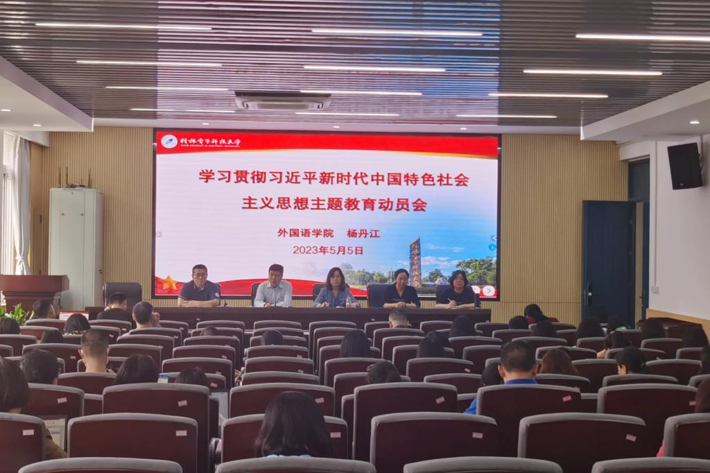5月5日,外国语学院在花江校区第三教学楼305会议室召开学习贯彻习近平新时代中国特色社会主义思想主题教育动员会,学院领导班子成员、全体党员参加会议,会议由学院党委书记杨丹江主持。