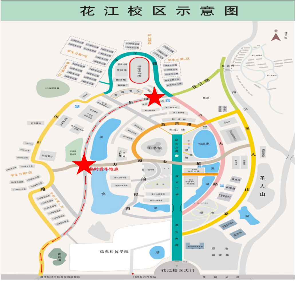 2.途经花江校区C大道与力港大道交汇口停留上客(图中五角星位置)