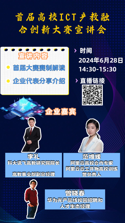 为帮助师生进一步了解首届大赛赛事规则,促进参赛团队与命题企业充分交流和提高答题质量,大赛组委会定于6月28日召开首届高校ICT产教融合创新大赛宣讲会。本次活动采用线上直播的形式,邀请首届大赛承办高校解读大赛赛制及赛程安排,同时邀请首届大赛命题企业代表从命题情况、答题要求、资源支持等方面做介绍。