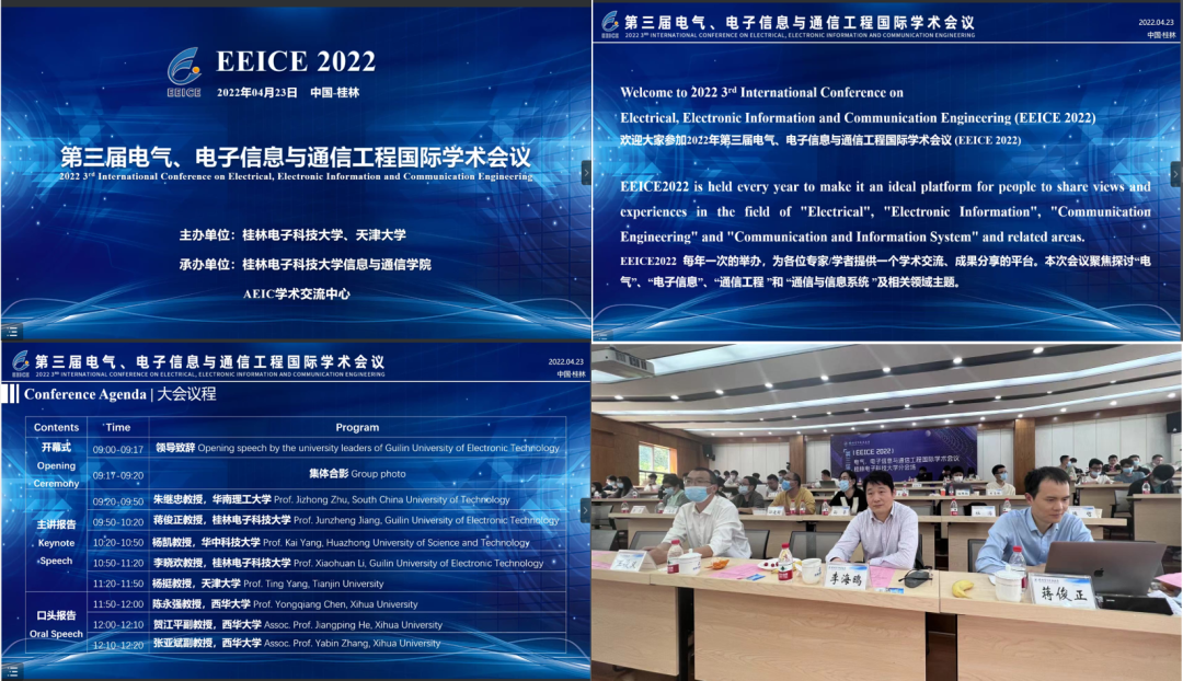 423日,第三届电气、电子信息与通信工程国际学术会议 (EEICE 2022)通过线上+线下(桂林电子科技大学分会场)相结合的形式隆重召开!本次会议由桂林电子科技大学和天津大学主办,桂林电子科技大学信息与通信学院、AEIC学术交流中心承办。