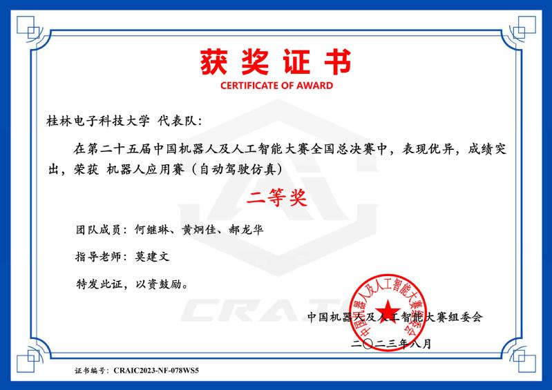 日前,实验室成员莫建文老师指导的学生团队(何继琳、黄炯佳、郝龙华组成)参加第二十五届中国机器人及人工智能大赛的机器人应用赛(自动驾驶仿真),获得全国总决赛二等奖。