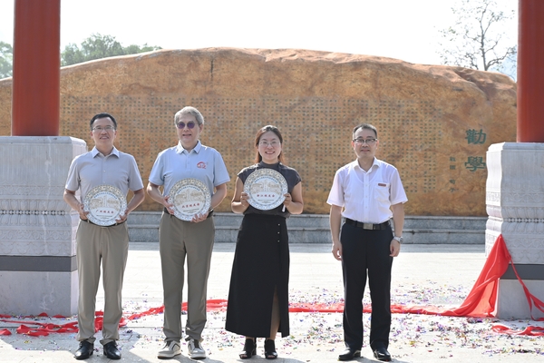 北京校友会会长傅强、广州校友会会长田野、浙江校友会秘书长马军妹分别发言,表达了对母校的深厚感情与持续关注,希望燕园成为集生态、育人、文化于一体的新的校园地标,承载故事,启迪未来,见证母校岁月流光。徐华蕊、张文涛、张波、傅强、田野、马军妹共同为“燕园”揭幕,徐华蕊为校友会颁发了纪念盘。
